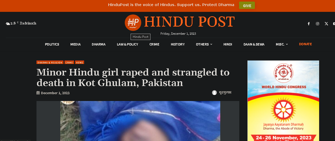 A 16-year-old Hindu girl Jamna was brutally raped and strangled to death in Kot Ghulam, Pakistan. Such tragic news has become almost everyday in Pakistani minority groups, where the tragedy highlights the difficult condition they endure. The terrible outcome of Jamna’s story serves as a sobering reminder of the pressing necessity for coordinated actions to alleviate minority hardship and guarantee their safety.