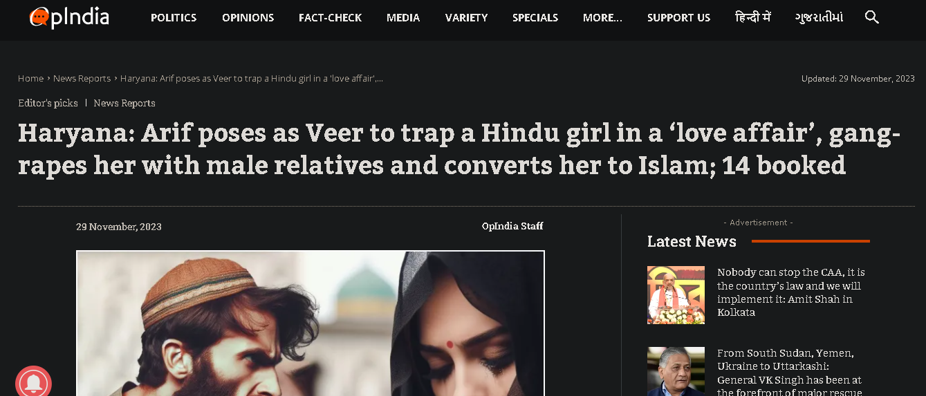 • Where did you come to know about this event from ? (Please provide source link):https://www.opindia.com/2023/11/haryana-arif-poses-as-veer-to-trap-hindu-girl-in-love-affair-gang-rapes-her-with-male-relatives-converts-her-to-islam/