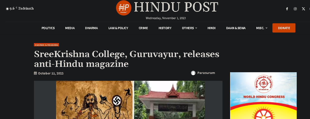 SreeKrishna College, Guruvayur, released their Union magazine featuring sacrilegious images of Hindu Dharma. The cover page depicts a four-armed half-naked Bhagwan-like figure, with Nazi or Hitler’s swastika put on the hands of a sanyasi. Further this magazine promotes distorted Hindu ideals. This is absolute distortion of the actual Guruvayurappan sacred idol.